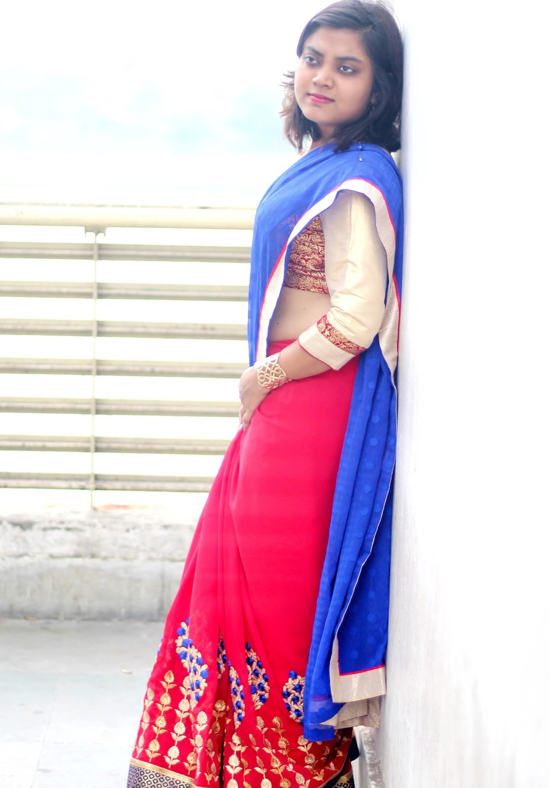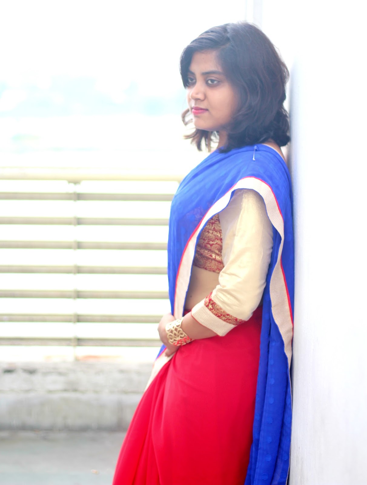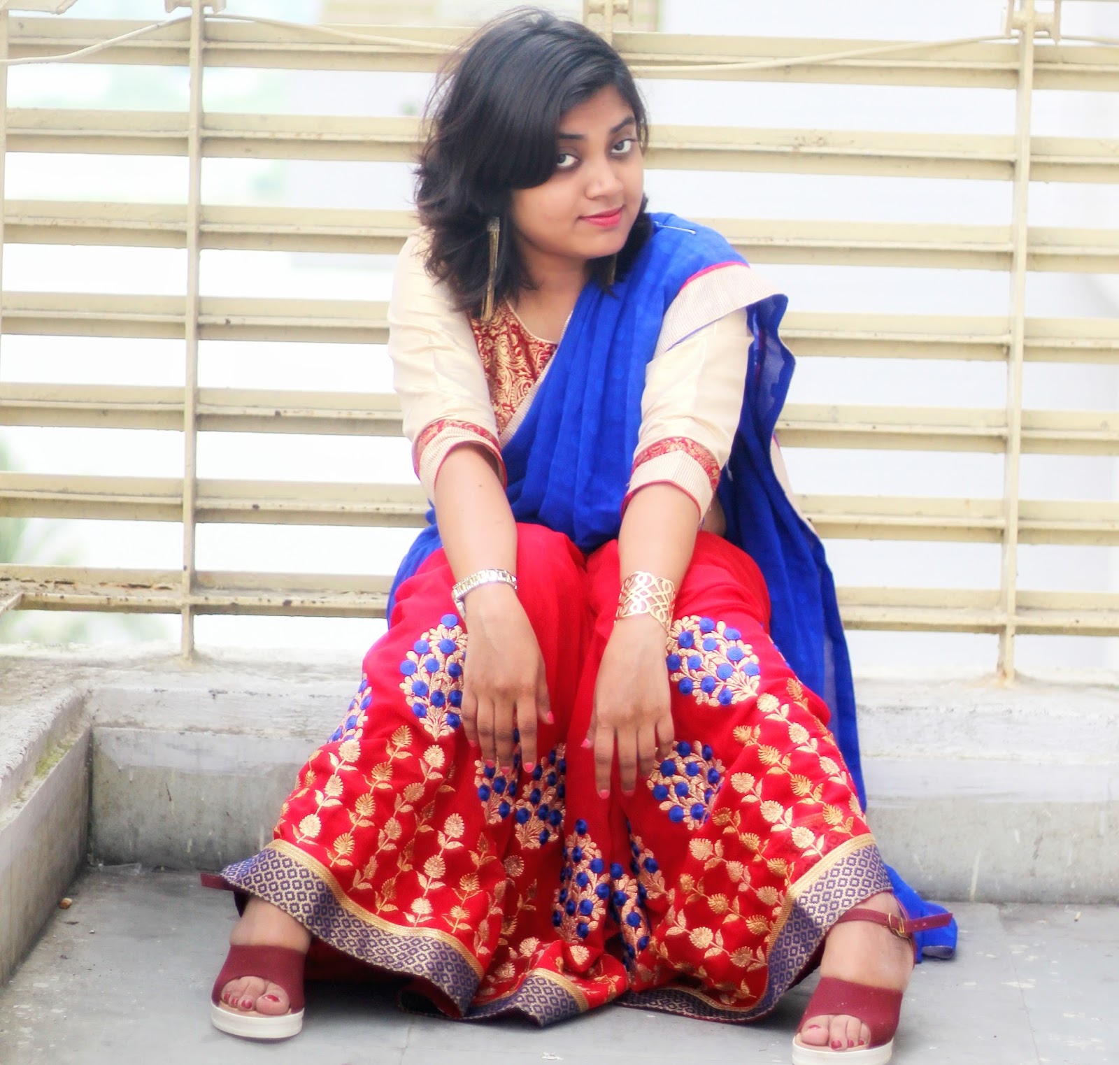 On the sixth day of Durga Puja, i.e. Sosthi, we call it in Bengali, I wrapped myself in a dual tone red-and-blue contrast jacquard and georgette saree, that stuck to me for so many hours like a kind and understanding friend and not for once made me felt alien in it.